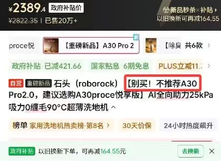 海报新闻记者 张庆斌 报道 近日,有消费者反映,在电商平台购买洗地机时,注意到很多斯通等品牌的热门型号在产品页面上写着“不购买、不推荐”的字样。同时,该平台还推荐了同一品牌的其他车型,造成消费者混淆。 3月19日,海报新闻记者(微信报道:HaibaoNewsSw)就此事采访了该品牌客服。客服表示,这种情况是电商平台系统出现错误。该电商平台客服表示,原因是更新异常,目前后台正常。从照片来看,石头扫地机器人A30Pro2.0洗地机页面明确写着“请勿购买,不推荐ndado”,同时还推荐了该品牌的A30Proce欢乐版。 A30Pro2.0扫地机售价约2389元nt补贴。记者搜索四通科技电商平台旗舰店,并未在页面上找到推荐的“A30Proce畅享版”。对于页面标签显示异常的问题,四通科技客服表示,该情况是电商平台系统错误导致的,品牌系列产品可以放心购买。该电商平台客服回应称,所标注的异常应该是页面刷新异常,不影响消费者正常下单。目前背景调查显示,其原为小米生态石科技,据称于2014年在北京成立,该公司为科创板上市公司。它原本是小米第一家生态链公司。目前独立运营,专注于智能清洁硬件领域。其主营业务为研发、清洁机器人、洗地机等智能清洁设备的制造和销售。其产品销往全球多个国家和地区。如果您能为我们提供新的建议,我们将不胜感激。一旦通过,我们将及时发布公告。海报新闻报道热线:010-64004224,举报邮箱:zhongbabaoliao@163.com。