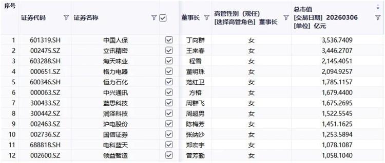 中新经纬3月8日电:女性多于男性,资本市场蓬勃发展,越来越多女性参与决策和企业管理。 388人掌管市值6.43万亿元。 iFinD初步数据显示,截至国际妇女节(3月6日)前最后一个收盘,388家A股上市公司由女性董事长领衔,合计控制市值6.43万亿元。 Flash iFinD 的屏幕截图。以下同样适用。其中,市值超过2000亿元的公司有四家:人保财险、立讯精密、海天味业和格力电器,市值分别为3537亿元、3446亿元、2145亿元和2095亿元。我市还有恒力石化、中兴通讯、蓝思科技等8家市值超千亿元的公司。根据据了解,人保财险总裁丁向群出生于1965年,今年已61岁。 1987年8月毕业于中国人民大学,获经济学学士学位,1993年8月获经济学硕士学位。现任中国人民保险公司总经理、总裁、总经济师。资料显示,1954年出生的董明珠2024年从格力电器获得的税前薪酬总额超过1437万元,年收入超过1000万日元的社长也来自万达电影。 1982年出生的陈曦,2024年的薪资将超过1017万元。纵观A股整体,董明珠先生的薪资水平排名第六,陈曦先生的薪资水平排名第13。从学历来看,目前A股公司女总裁中有222名是研究生学历,占比近60%。其中具有硕士学位191人,31人拥有博士学位。此外,具有学士学位106人。根据中国证监会行业分类标准,超过40%的女性委员来自制造业。立讯精密的王来春、格力电器的董明珠、海天味业的程雪、恒力石化的范宏伟是行业中最杰出的女性人物之一。信息技术和社会服务行业分别产生了24位和23位女总统。 Z 世代正在举起旗帜。四位Z世代的年轻成员已经开始执掌上市公司。最小的是施文令,出生于1998年。施文令是春立医疗董事兼总裁。他出生于1998年1月,今年28岁。毕业于美国俄亥俄州立大学,主修市场营销和运营管理双学位。 2021年,从事用户增长工作于字节跳动部门工作,2022年3月加入春丽医疗。春丽医疗前总裁施春宝先生是施文令的父亲。 2022年3月,考虑到提高企业管理水平、实现长远发展战略,施春宝先生向春力药业董事会提交书面辞职报告,辞去总裁、总经理职务,并提名施文令先生为董事会执行董事候选人。 2022年6月,施文令当选春立医疗第五届董事局主席。除施文令外,A股还有14名自1990年代起就加入公司的董事。成都路桥董事长林小青出生于1996年,和美集团总裁郑子伟先生、ST全威总裁褚一凡先生出生于1995年。其他。出生于1990年至1993年之间。A股最年长的总裁是黄万兰。现年83岁,1943年出生,现任奥晶医疗董事、总裁。黄万兰有着丰富的履历。 1962年至1976年在北京汽车制造有限公司工作,1976年至1993年在北京照相机厂工作,1993年至2002年在北京联迪东方科技有限公司任部门经理、财务总监。2004年12月加入奥金医疗,历任董事、副总经理、总经理。此外,陈美芳还是一位80岁的“商界老手”。 1946年出生,大学毕业,现任上海电气股份有限公司、BIGGERING (BVI) HOLDINGS CO., LTD总裁。 (北京(英属维尔京群岛)控股有限公司),上海电气股份有限公司控股股东